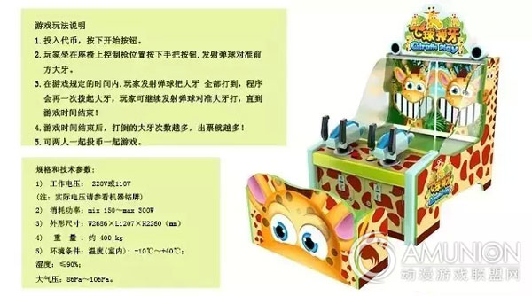 投入代币,按下开始按钮开始游戏,玩家坐在座椅上控制枪位置按下手把按钮.发射弹球对准前方大牙。在游戏规定的时间内.玩家发射弹球把大牙全部打到,程序会再一次拨起大牙,玩家可继续发射弹球对准大牙打,直到游戏时间结束! 打倒的大牙次数越多,赢得彩票就越多!可两人一起游戏呦!